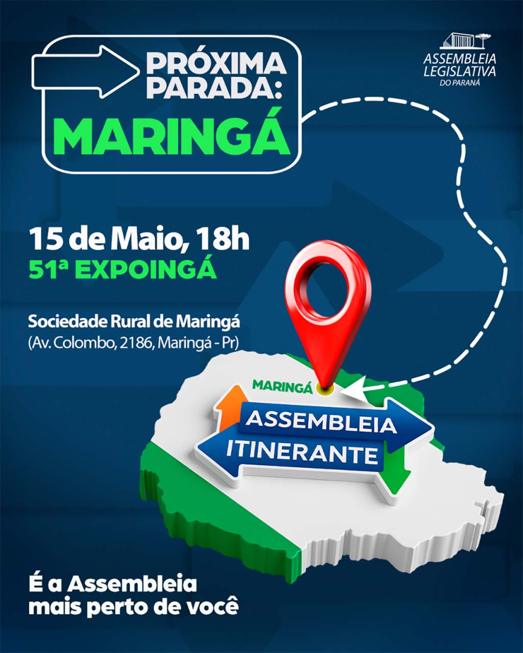A Assembleia Itinerante, ação de interiorização do Poder Legislativo paranaense, realiza nesta quinta-feira (15), a partir das 18 horas, sua 22ª sessão especial. O evento ocorre dentro da 51ª edição da Expoingá, promovida pela Sociedade Rural de Maringá. Esta será a segunda vez que o município recebe a iniciativa.