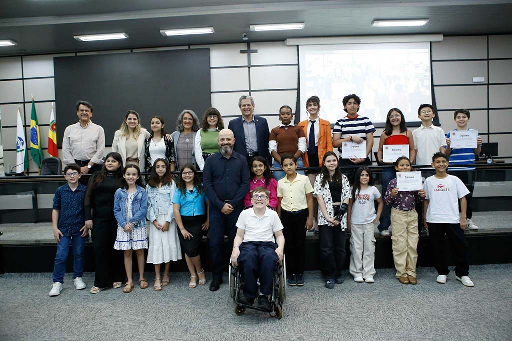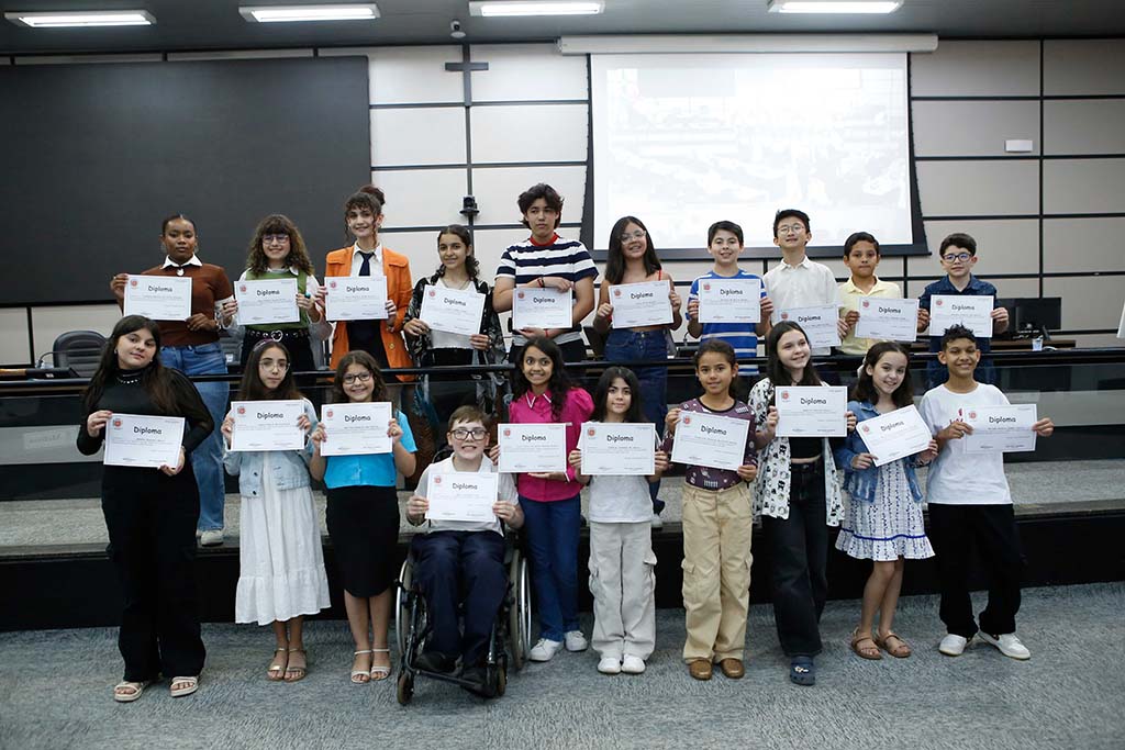 Na sequência, ocorreu a entrega dos diplomas aos vereadores e vereadoras mirins da Legislatura 2024/2025, reconhecendo o trabalho desenvolvido ao longo do mandato.
