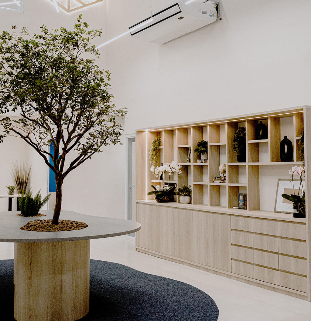 A sede possui 360 metros quadrados, distribuídos entre piso térreo e mezanino, com ambiente moderno, visual clean e espaços pensados para o dia a dia da equipe. O local conta com salas de atendimento, cabines acústicas para chamadas e negociações com privacidade, espaço para treinamentos, uma das premissas do negócio, e áreas de convivência, reforçando a proposta de ambiente integrado e acessível. A sala do diretor, inclusive, é acessível. “Eu quero estar perto, acessível, ajudando o corretor, participando das negociações e acompanhando tudo”, afirma.