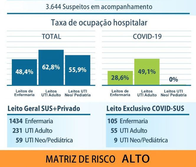O boletim de hoje também atualiza os números de leitos geral adulto e UTI adulto Covid-19, somando os 10 novos leitos estruturados no Hospital Universitário da UEM para recuperação de pacientes da cidade e região. Esse pode ser um motivador da queda da taxa de ocupação de UTI SUS adulto exclusiva para Covid para 49,1%.