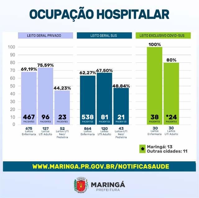 Desde o início da pandemia foram notificados 337.919 casos de Covid-19 em Maringá, dos quais 108.350 casos foram confirmados e 88.825 casos foram recuperados. Foram registrados 1.689 óbitos por Covid-19.