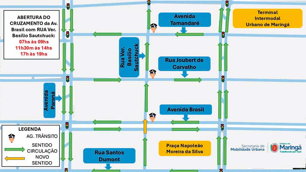 Até que as sinalizações e instalação de semáforos sejam concluídas, os agentes de trânsito estarão presentes para orientar os condutores e garantir a segurança viária nos cruzamentos da Rua Vereador Basílio Sautchuk com a Avenida Brasil, Rua Joubert de Carvalho e com a Avenida Tamandaré.