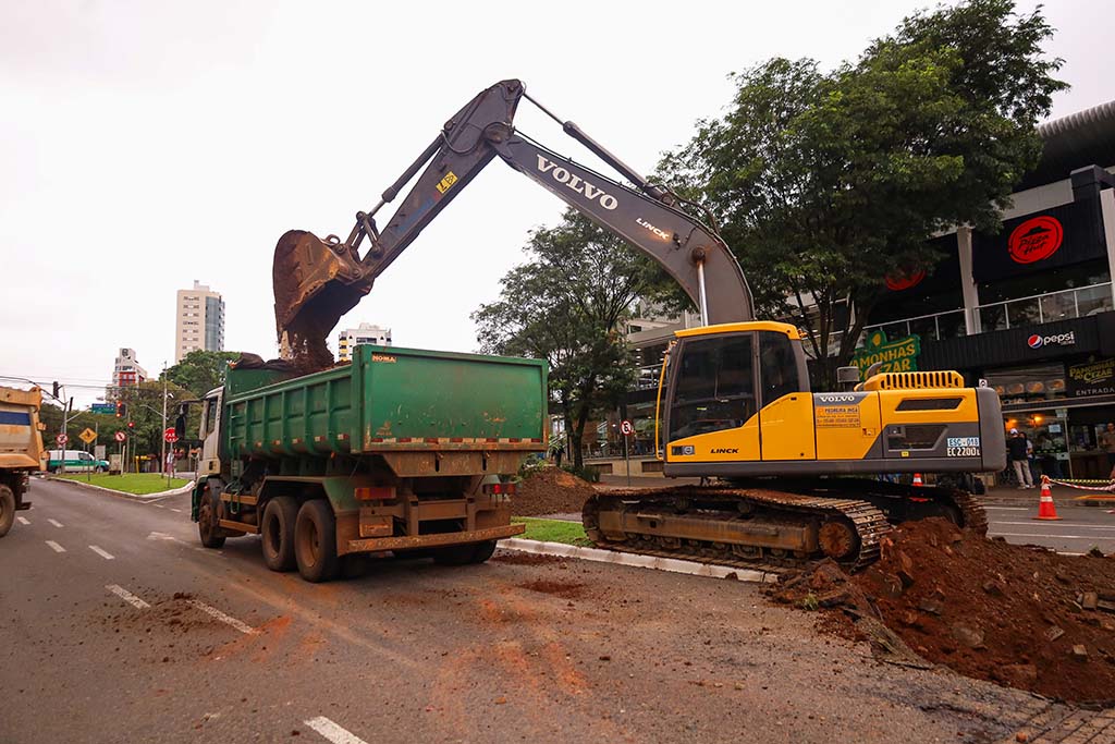 A Prefeitura de Maringá, por meio das secretarias de Infraestrutura e Limpeza Urbana, iniciou ainda na segunda-feira (13), os reparos no canteiro central da Avenida São Paulo, entre as avenidas Mauá e Horácio Raccanello Filho, após os danos causados pela chuva.
