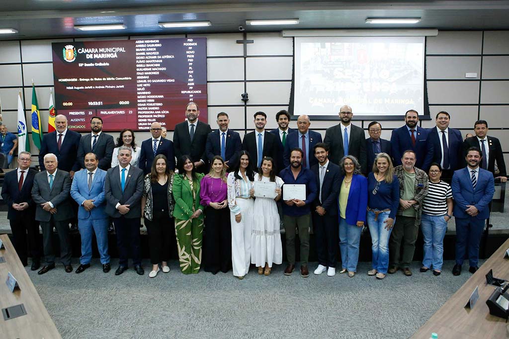 A Câmara Municipal de Maringá reconhece o trabalho e iniciativas que promovem a cidadania e buscam dar exemplos de solidariedade para nossa sociedade. Na sessão da quinta-feira (4/9), o casal Nóbili Augusto Jarletti e Andreia Pinheiro Jarletti foi homenageado com o Título do Mérito Comunitário, em reconhecimento ao importante trabalho realizado junto ao programa Família Acolhedora, que transformou a vida de inúmeras crianças em situação de vulnerabilidade social.
