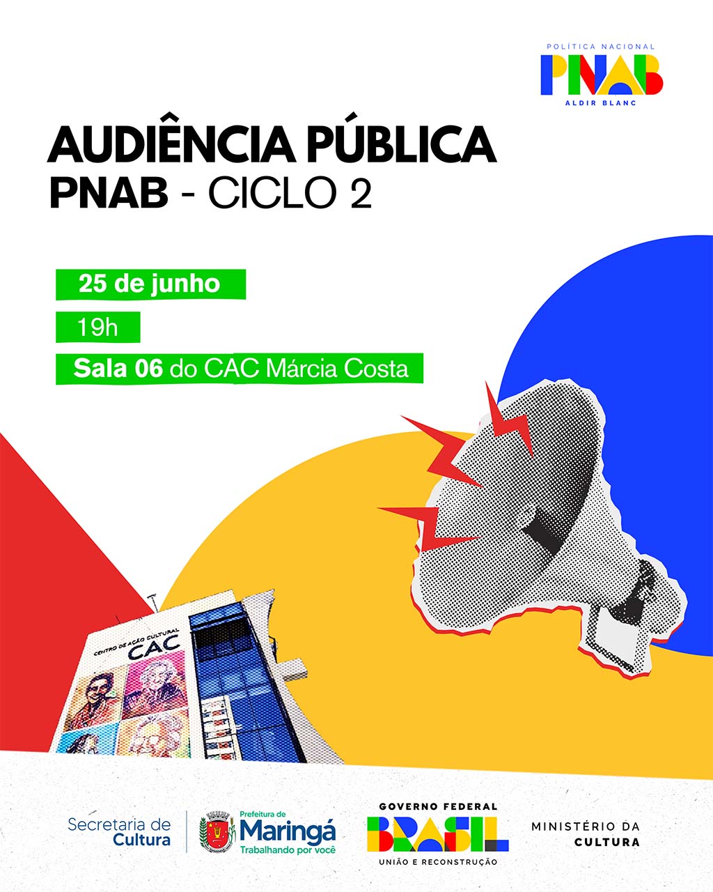 A Prefeitura de Maringá, por meio da Secretaria de Cultura, realiza nesta quarta-feira (25), às 19h, no Centro de Ação Cultural Márcia Costa (CAC), na Av. XV de Novembro, 514 – Centro, a audiência pública sobre a Política Nacional Aldir Blanc de Fomento à Cultura (PNAB). O objetivo é dialogar com artistas, agentes culturais e com a comunidade em geral sobre a aplicação dos recursos recebidos pelo município para fomento à cultura, por meio do programa do Governo Federal instituído pela lei nº 14.399.