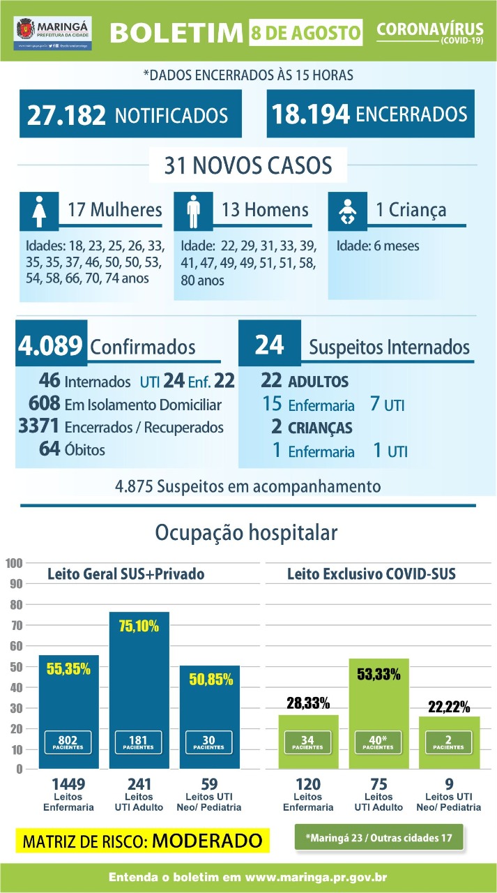 O boletim deste sábado (8/8), da Secretaria de Saúde de Maringá registra 31 novos casos de Covid-19. Confirmada mais uma morte.