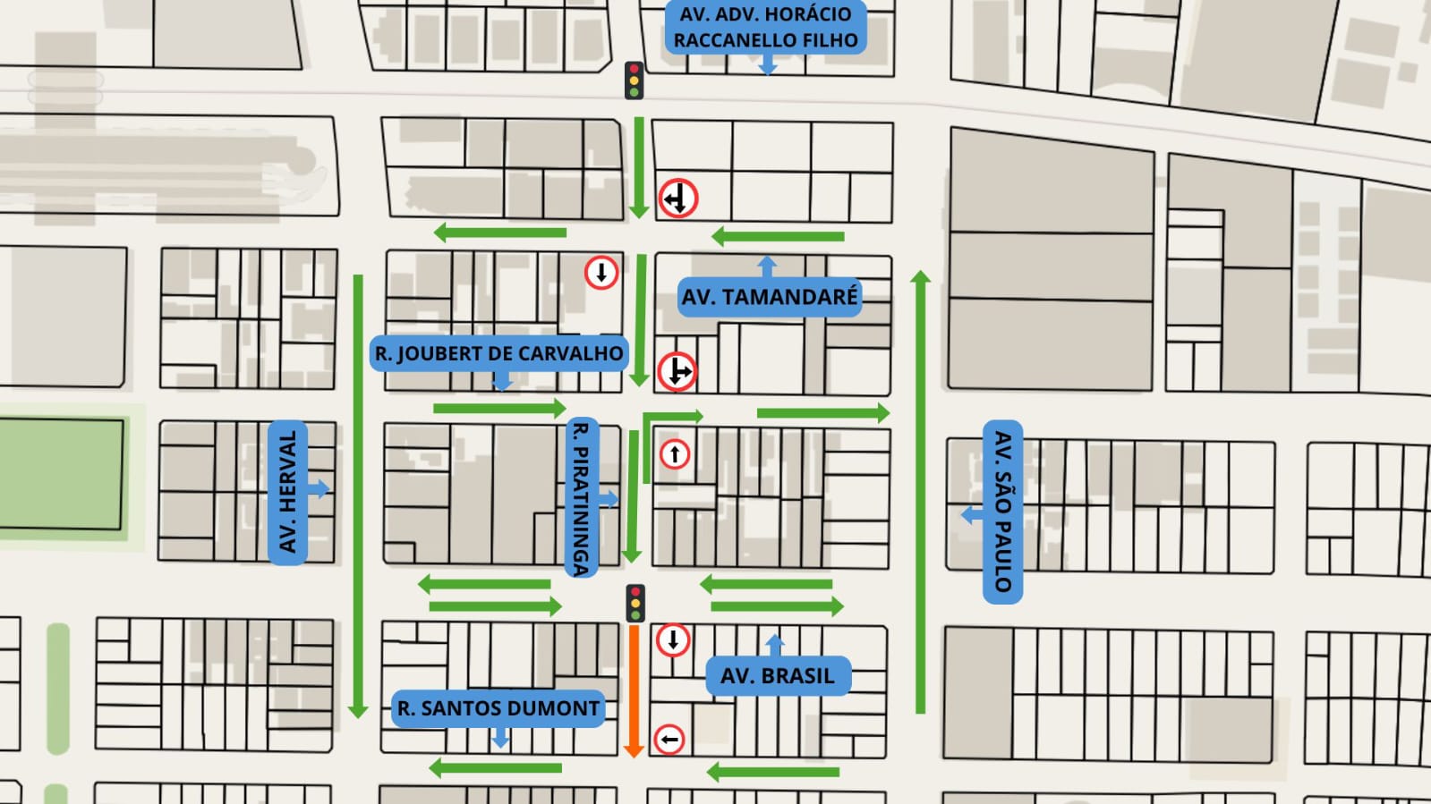 Rua Piratininga – Volta a ter sentido único entre a Avenida Horácio Raccanello Filho em direção à Avenida Brasil. Já no trecho entre a Rua Joubert de Carvalho e a Avenida Brasil, fica mantido o sentido duplo; no trecho compreendido entre a Avenida Brasil e Rua Santos Dumont, a rua passa a ser de sentido único em direção à Rua Santos Dumont.