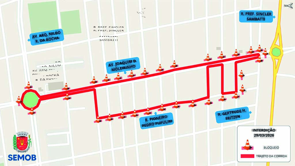 Corrida Conecta Run – Para a realização da corrida, neste domingo (29), das 6h às 8h30, haverá interdições temporárias em vias da região da Avenida Joaquim Duarte Moleirinho, com percurso pelas ruas Pioneiro Antônio Castanha, Pioneiro Pedro Pupulim, Pioneiro Mário Marangoni, Universo, Galáxia e Cometa, com bloqueios ao longo do percurso até o retorno ao ponto de largada.