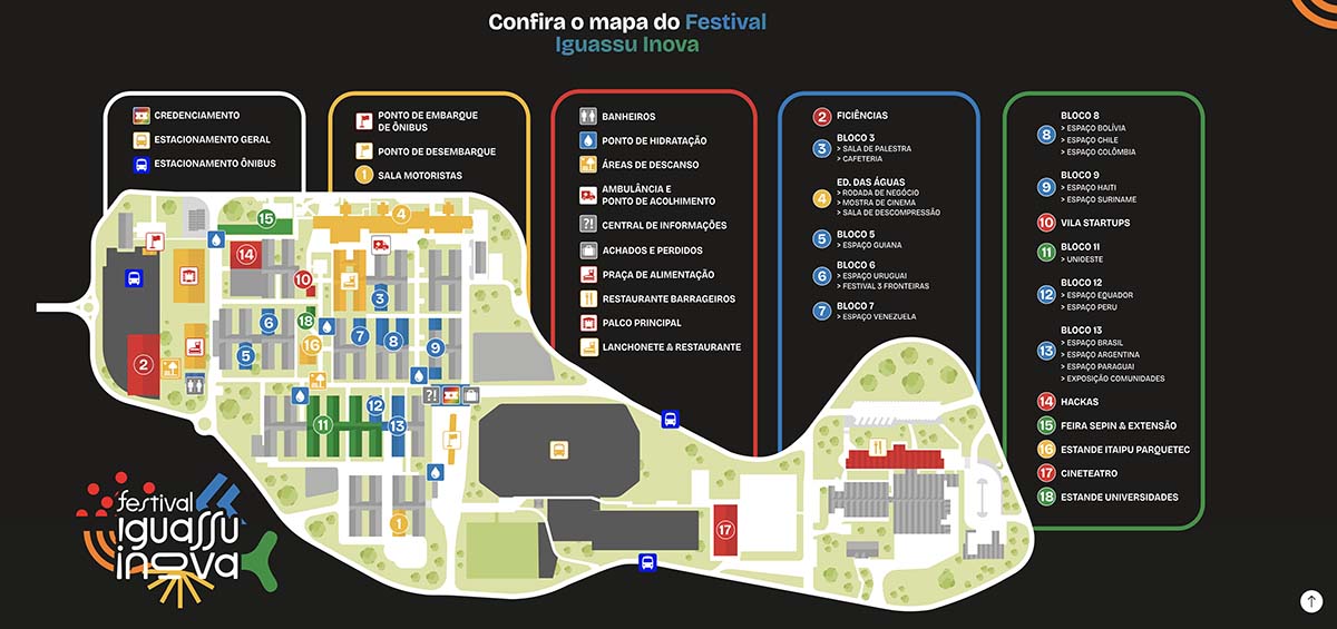 Um dos maiores encontros de inovação, tecnologia, ciência e sustentabilidade do Sul do Brasil, o Festival Iguassu Inova, se prepara para abrir as portas ao público nesta quarta-feira (22). Para os participantes aproveitem ao máximo a experiência, a organização disponibilizou as localizações dos principais palcos e espaços do evento. Assim, os visitantes podem se planejar e encontrar facilmente os locais das palestras, atrações e exposições que integram a programação, realizada até o sábado (25), no Itaipu Parquetec, em Foz do Iguaçu.