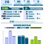 Segundo o boletim da Saúde, desde o início da pandemia, foram registrados 27.391 casos positivos de coronavírus, com 384 óbitos. Casos em isolamento domiciliar somam 1.278; Casos encerrados ou recuperados são 25.639; e internados estão 91 pacientes, sendo 61 em Enfermarias e 30 em UTIs.