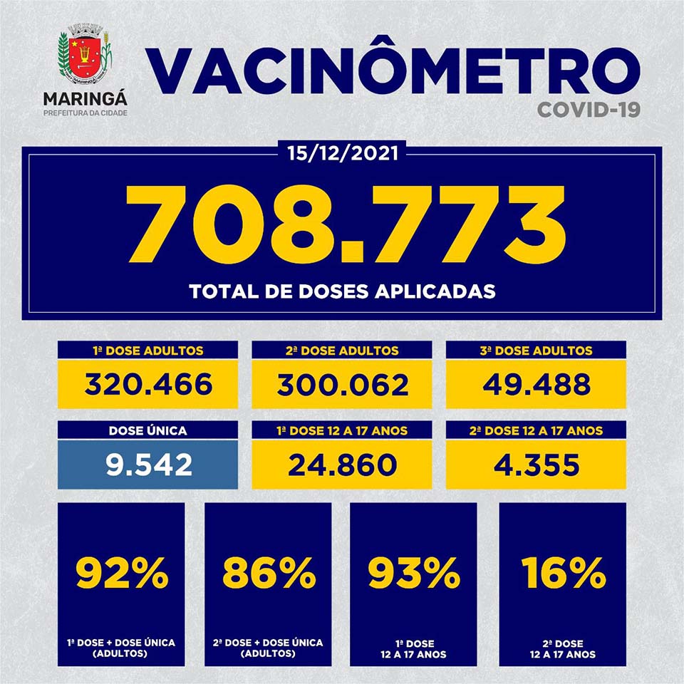 A Secretaria de Saúde da Prefeitura de Maringá, vacinou nesta terça-feira, 14 de dezembro, 128 pessoas com a 1ª dose da vacina contra a Covid-19 (50 adolescentes entre 12 e 17 anos), 585 pessoas com a 2ª dose (121 adolescentes entre 12 e 17 anos), e 1.089 pessoas com a 3ª dose.